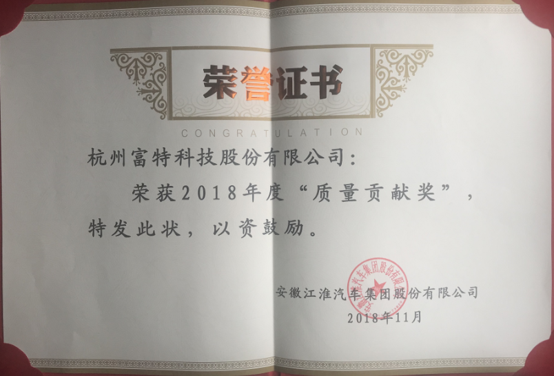 公司榮獲江淮汽車集團(tuán)2018年度"質(zhì)量貢獻(xiàn)獎"