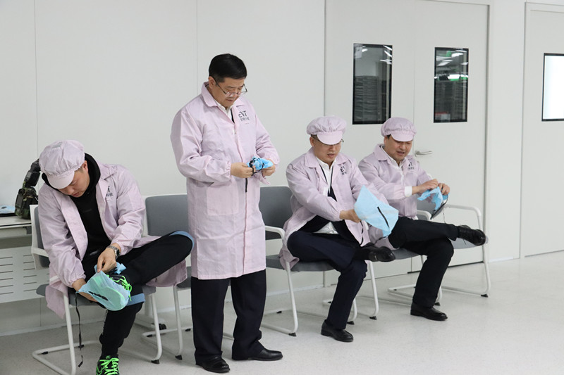 因生產線作業要求嚴格,進入生產線須按要求著裝靜電服,佩戴靜電帽,穿戴靜電鞋套。在倪斌先生的演示下,各位領導們有序完成進入生產線前的準備工作。